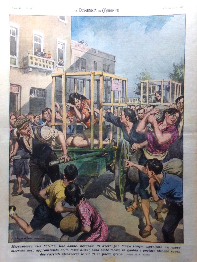 Mercantesse alla berlina. Due donne, accusate di avere per lungo tempo esercitato un esoso mercato nero, approfittando della fame altrui, sono state messe in gabbia e portate attorno sopra due carretti attraverso le vie di un paese greco (Walter Molino)