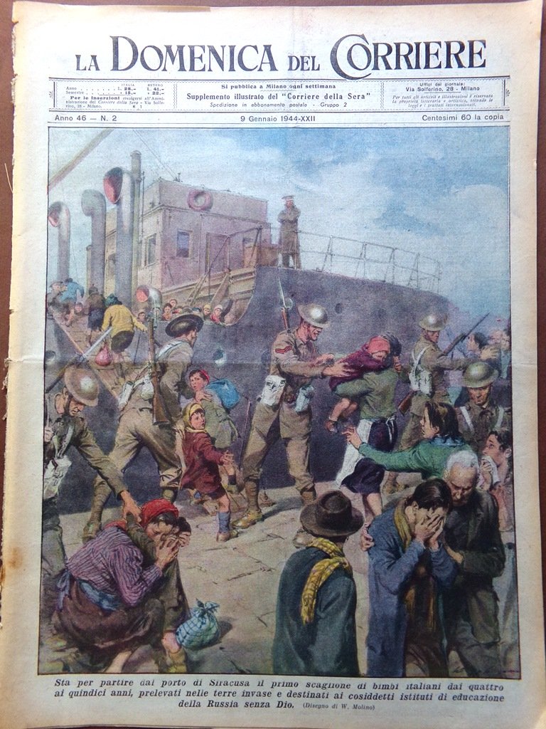 Sta per partire dal porto di Siracusa il primo scaglione di bimbi italiani dai quattro ai quindici anni, prelevati dalle terre invase e destinati ai cosiddetti istituti di educazione della Russia senza Dio (Walter Molino)