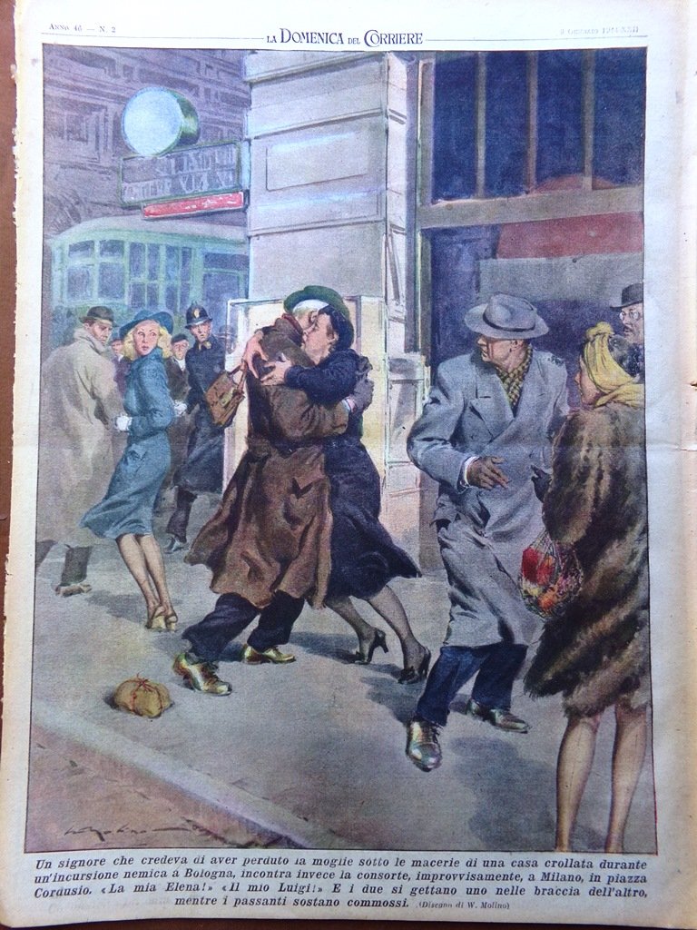 Un signore che credeva di aver perduto la moglie sotto le macerie di una casa crollata durante un'incursione nemica a Bologna, incontra invece la consorte, improvvisamente, a Milano, in piazza Cordusio. E i due si gettano uno nelle braccia dell'altro mentre i passanti sostano commossi (Walter Molino)