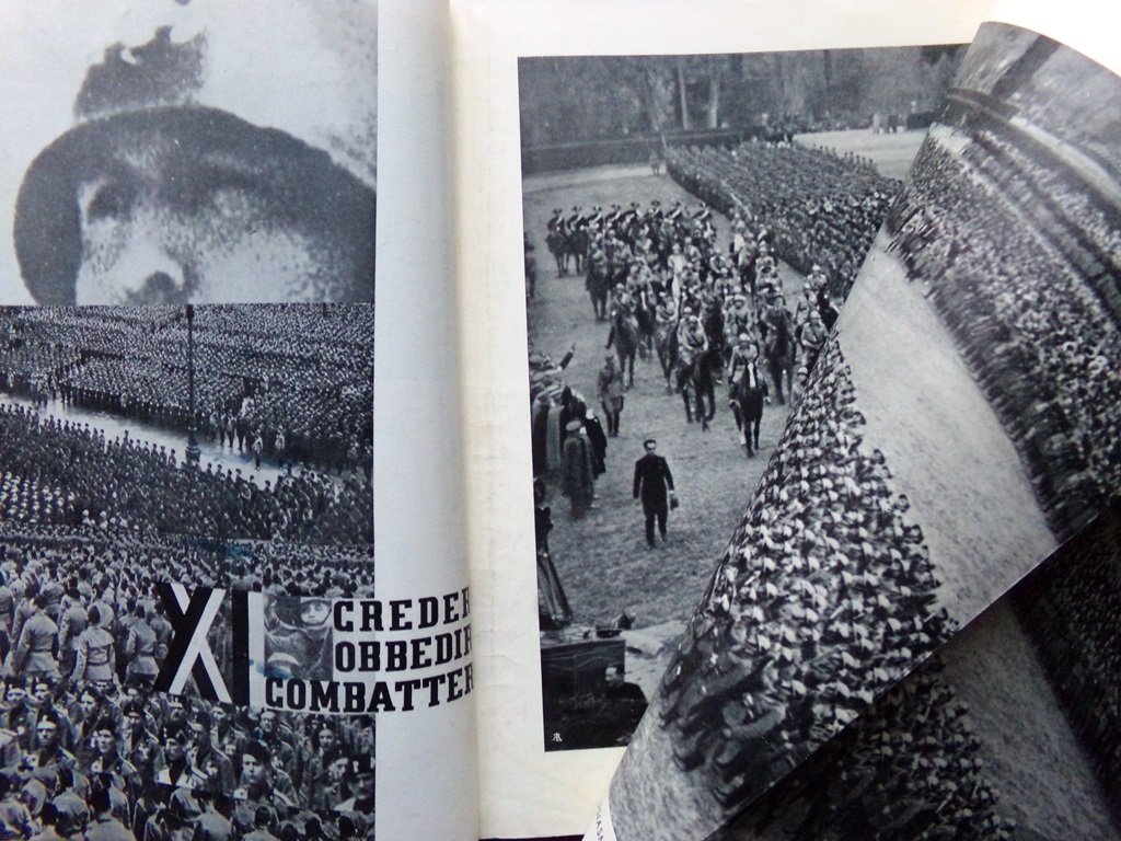 Nell' undecimo annuale della fondazione della milizia il duce passa in rivista le quadrate legioni in Piazza di Siena (fotografia a 3 pagine)