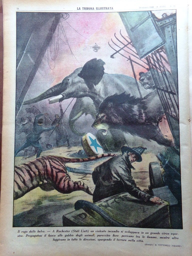 A Rochester (Stati Uniti) un violento incendio si sviluppava in un grande circo equestre. Propagatosi il fuoco alle gabbie degli animali, parecchie fiere perivano tra le fiamme (disegno di Vittorio Pisani)