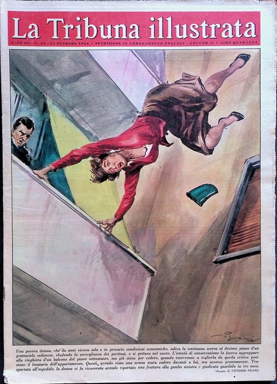 Una povera donna, che da anni viveva sola e in precarie condizioni economiche, saliva la settimana scorsa al decimo piano d'un grattacielo milanese, eludendo la sorveglianza dei portinai, e si gettava nel vuoto. L'istinto di conservazione la faceva aggrappare alla ringhiera d'un balcone del piano sottostante, ma già stava per cedere, quando intervenne a toglierla da quella critica posizione il locatario dell'appartamento. Questi, avendo visto una massa scura cadere davanti a lui, era accorso prontamente. Trasportata all'ospedale, la donna vi fu ricoverata avendo riportato una frattura alla gamba sinistra e giudicata guaribile in tre mesi.