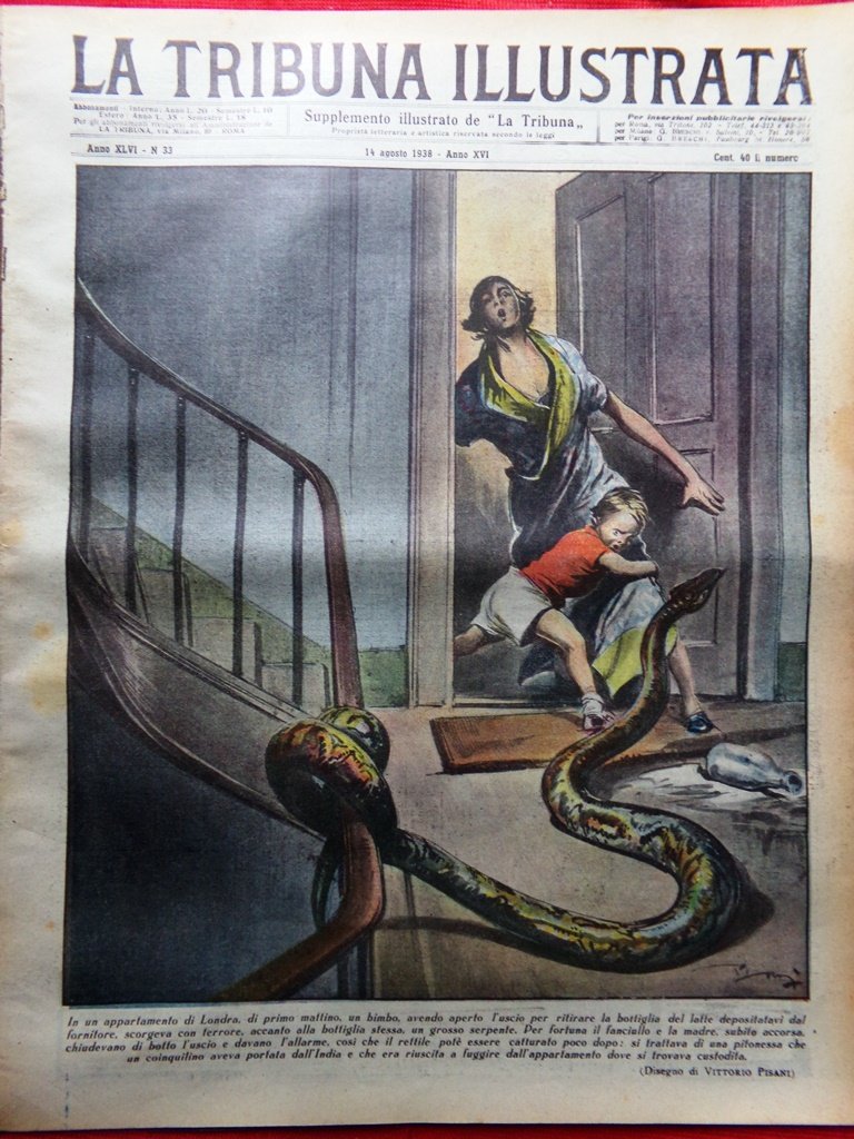 In un appartamento di Londra, di primo mattino, un bimbo, avendo aperto l'uscio per ritirare la bottiglia del latte depositatavi dal fornitore, scorgeva con terrore, accanto alla bottiglia stessa, un grosso serpente. Per fortuna il fanciullo e la madre, subito accorsa, chiudevano di botto l'uscio e davano l'allarme così che il rettile potè essere catturato poco dopo: si trattava di una pitonessa che un coinquilino aveva portata dall'India e che era riuscita a fuggire dall'appartamento dove si trovava custodita (disegno di Vittorio Pisani)