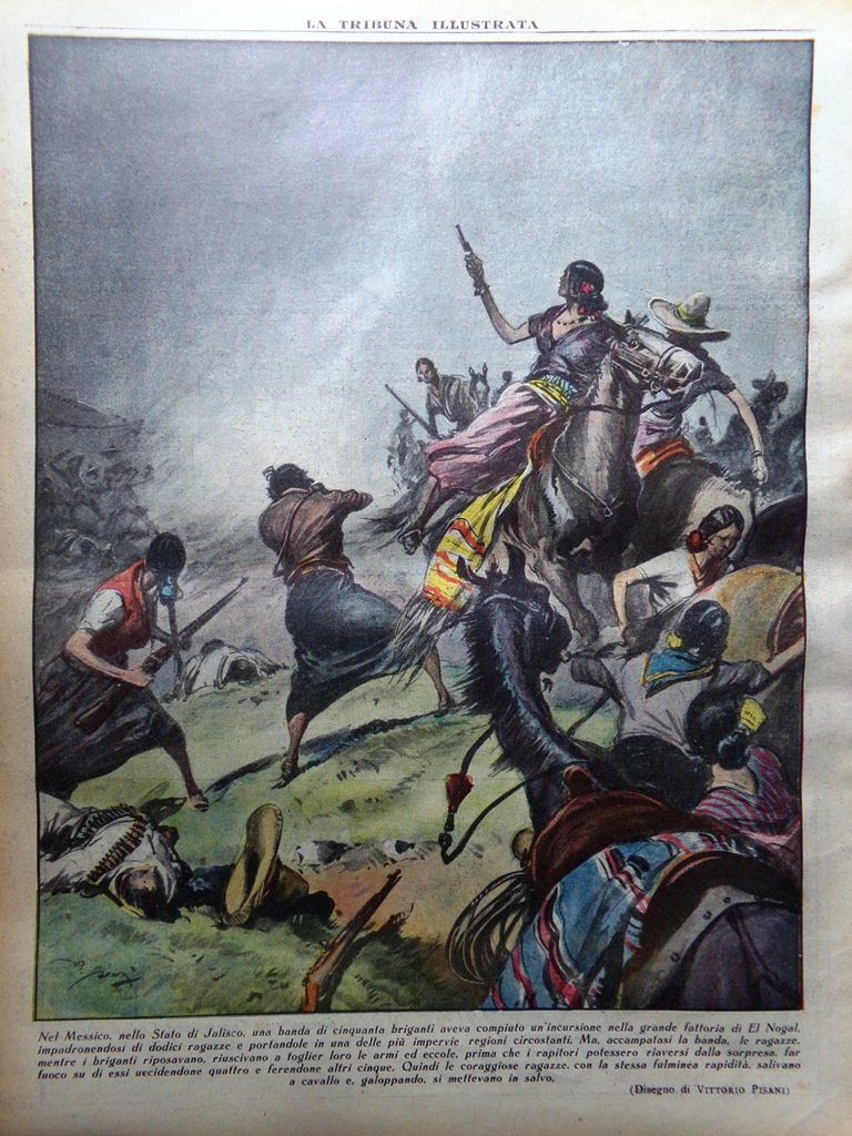 Nel Messico, nello stato di Jalisco, una banda di cinquanta briganti aveva compiuto un'incursione nella grande fattoria di El Nogal, impadronendosi di dodici ragazze e portandole in una delle più impervie, regioni circostanti. Ma accampatasi la banda, le ragazze mentre i briganti riposavano, riuscivano a toglier loro le armi ed eccole, prima che i rapitori potessero riaversi dalla sorpresa, far fuoco su di essi uccidendone quattro e ferendone altri cinque. Quindi le coraggiose ragazze, con la stessa fulminea rapidità, salivano a cavallo e, galoppando, si mettevano in salvo (disegno di Vittorio Pisani)