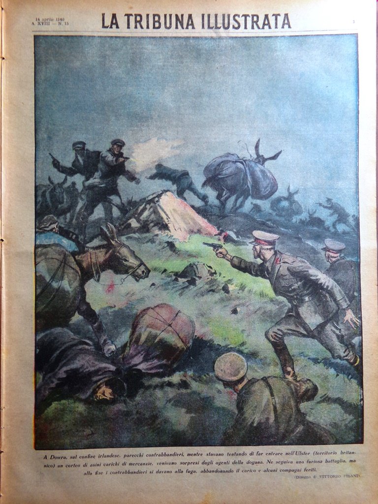 A Dowra, sul confine irlandese, parecchi contrabbandieri, mentre stavano tentando di far entrare nell'Ulster un corteo di asini carichi di mercanzie, venivano sorpresi dagli agenti della dogana. Ne seguiva una furiosa battaglia e alla fine i contrabbandieri si davano alla fuga (disegno di Vittorio Pisani)