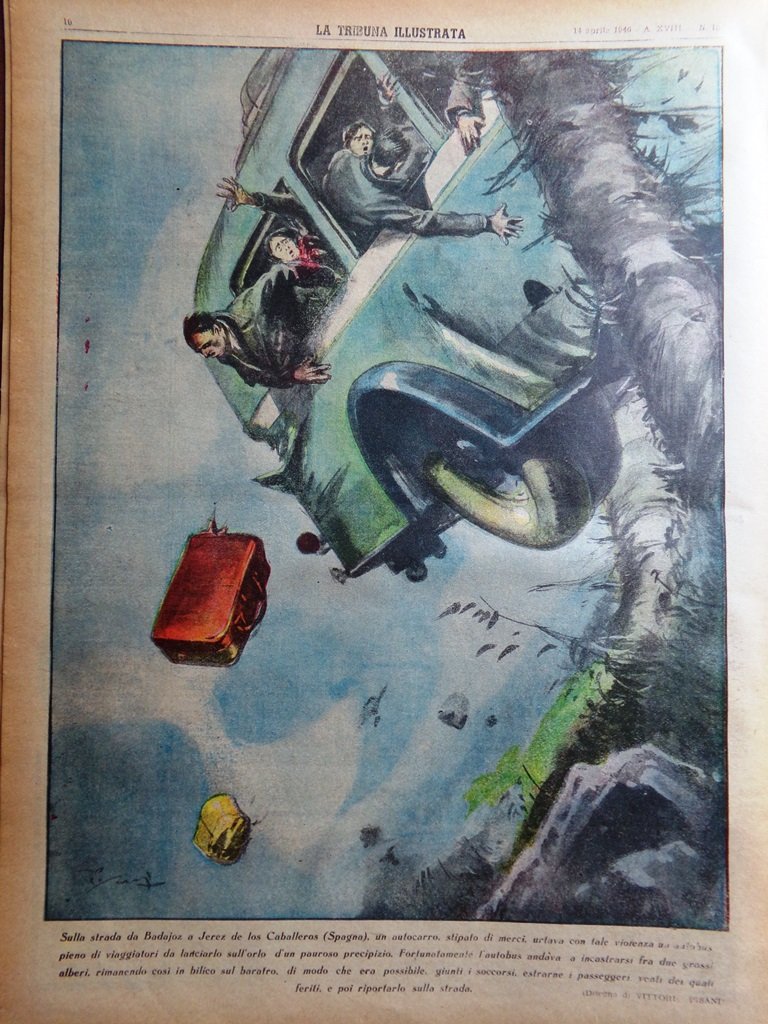Sulla strada da Badajoz a Jerez de los Caballeros (Spagna), un autocarro, stipato di merci, urtava con tale violenza un autobus pieno di viaggiatori da lanciarlo sull'orlo di un precipizio (disegno di Vittorio Pisani)