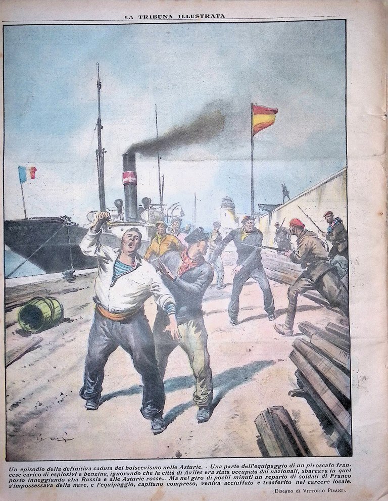 Un episodio della definitiva caduta del bolscevismo nelle Asturie. Una parte dell'equipaggio di un piroscafo francese carico di esplosivi e benzina, ignorando che la città di Aviles era stata occupata dai nazionali, sbarcava in quel porto inneggiando alla Russia e alle Asturie rosse. Ma nel giro di pochi minuti un reparto di soldati di Franco s'impossessava della nave, e l'equipaggio, capitano compreso, veniva acciuffato e trasferito nel carcere locale (disegno di Vittorio Pisani)