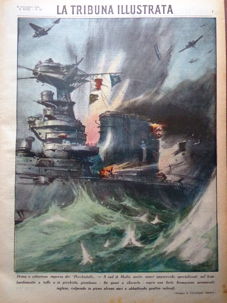 Prima e vittoriosa impresa dei "Picchiatelli" (Stuka). A Sud di Malta nostri nuovi apparecchi piombano sopra una forte formazione aeronavale inglese colpendo in pieno alcune navi e abbattendo quattro velivoli (disegno di Vittorio Pisani)
