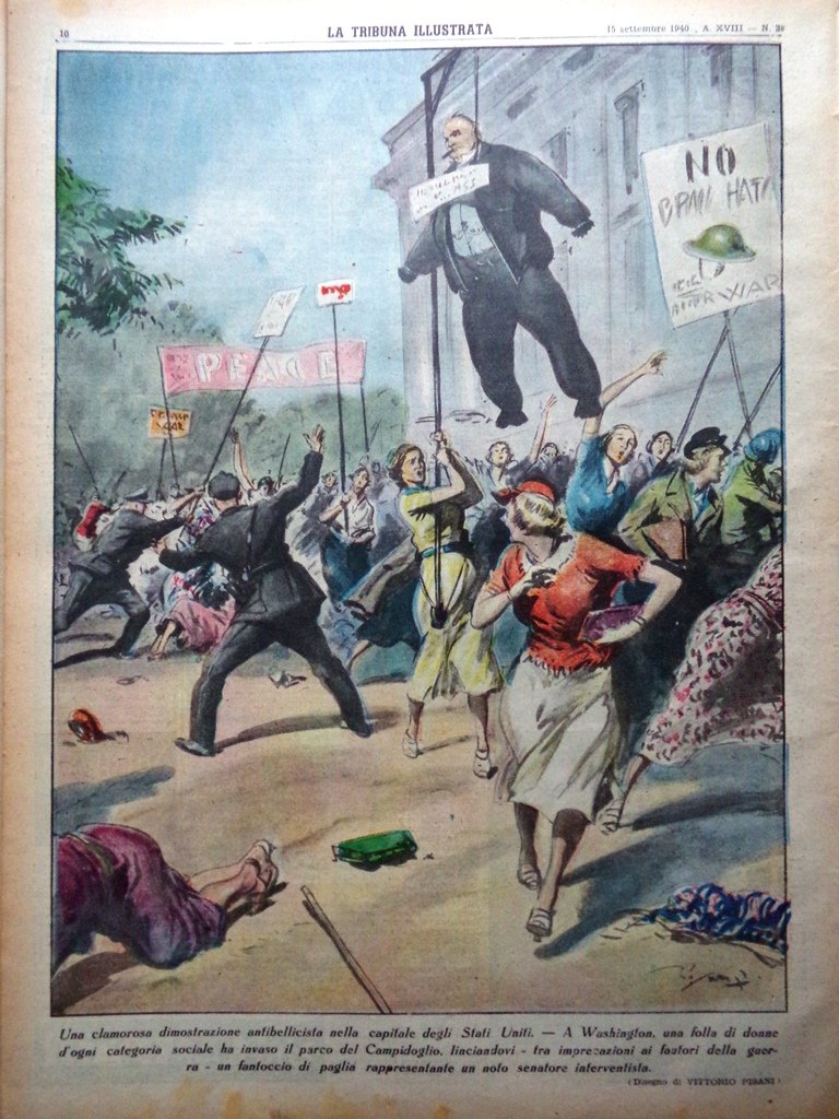 Una clamorosa dimostrazione antibellicista nella capitale degli Stati Uniti. A Washington una folla di donne ha invaso il parco del Campidoglio lincandovi un fantoccio di paglia rappresentante un noto senatore interventista (disegno di Vittorio Pisani)