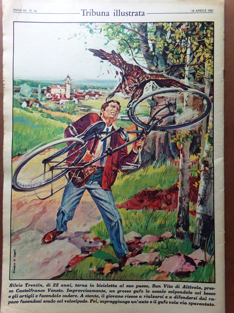Silvio Trentin di 22 anni torna in bicicletta al suo paese, San Vito di Altivola, presso Castelfranco Veneto . Improvvisamente, un grosso gufo lo assale colpendolo col becco e gli artigli e facendolo cadere. A stento il giovane riesce a rialzarsi e a difendersi dal rapace facendosi scudo col velocipede (disegno di Uggeri)