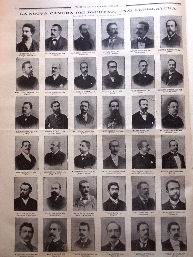 La nuova camera dei deputati: XXI legislatura - Enrico Ferri, Nicola Vischi, Umberto Serristori, Andrea Costa, Gaspare Colosimo, Giustino Fortunato, Luigi Contarini, Nicola Spada, Lud. Ceriana-Mayneri, Michele Torraga, Felice Chiapusso, Giacomo Cortese, Carlo Rizzetti, Roberto Rampoldi, Francesco Tripepi, Carlo Gallini, Marco Rocco, Francesco Spirito, Luigi Borsarelli, Alessandro Fortis, Francesco Tedesco, G. Giordano-Apostoli, Gianforte Suardi, Antonio Salandra, Gaetano Calvi, Pietro Bertolini, Luigi De Andreis, Luigi Rava, Andrea Sola, Antonio di Sangiuliano, Alberto Borciani, Felice Santini, Luigi Montemartini, A. Sapuppo, Annibale Vigna, Italo Pozzato