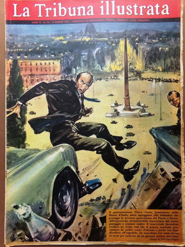 Il quarantottenne Pietro Costa, funzionario della Banca d'Italia, stava appoggiato alla balaustra che protegge la terrazza panoramica del Pincio a Roma. All'improvviso un'automobile s'avventava dal vicino posteggio e cozzava contro il muricciolo facendone crollare un tratto così che il povero avvocato precipitava da undici metri d'altezza e poche ore dopo decedeva all'ospedale. La macchina era stata messa in moto per scherzo da un giovane autista novellino (disegno di Vittorio Pisani)