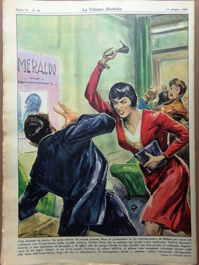 La nota attrice di rivista Lisetta Nava si presentava in un cinema-teatro di Milano per avere un colloquio con l'impresario della sorella minore, Tonini Nava che si esibisce nel locale come soubrette. Voleva discutere intorno a una questione di famiglia e di affari che da tempo divide le due sorelle, ma ben presto il colloquio degenerava in un aspro litigio. A un certo punto l'artista, al colmo dell'ira, si sfilava una scarpetta vibrando alcuni corpi alla testa dell'impresario dopo di che si allontanava. Il malcapitato ferito e contuso veniva ricoverato all'ospedale (disegno di Vittorio Pisani)
