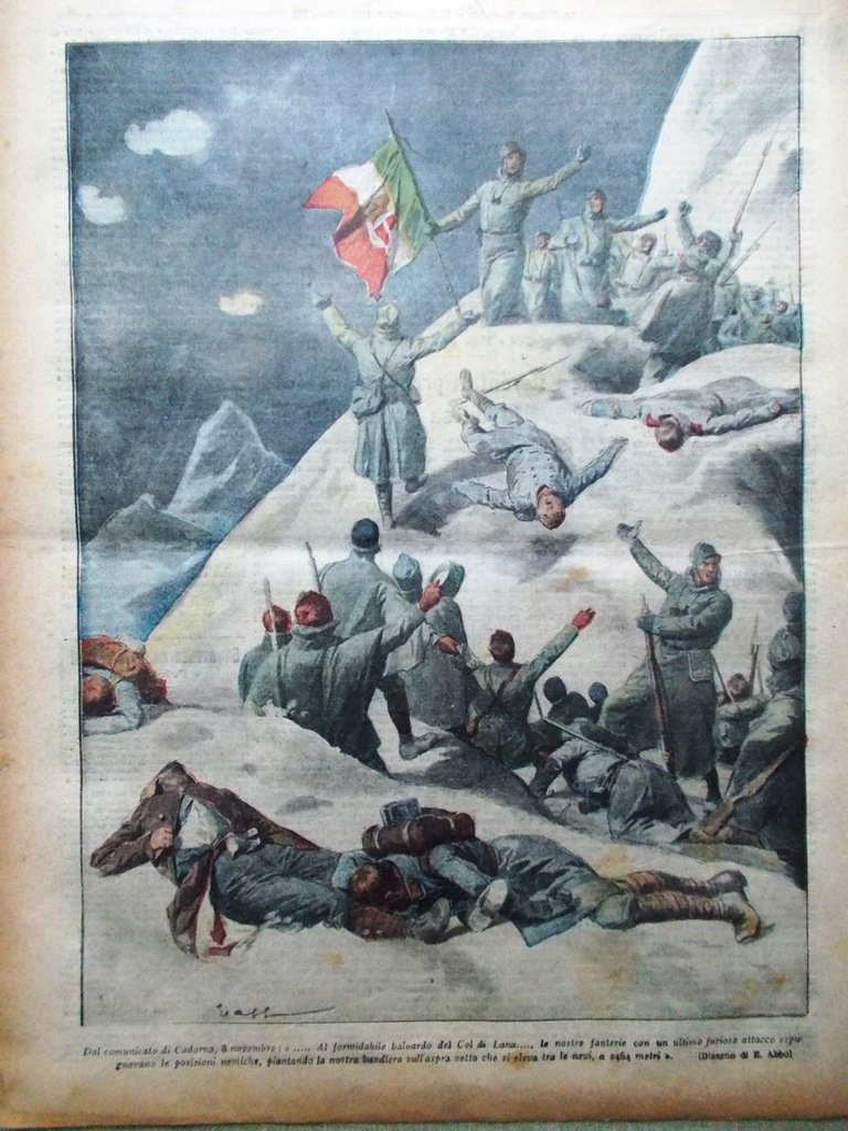 Dal comunicato di Cadorna, 8 novembre: ".al formidabile baluardo del Col di Lana, le nostre fanterie con un ultimo furioso attaco espugnavano le posizioni nemiche, piantando la nostra bandiera sull'aspra vetta che si eleva tra le nevi." (disegno di E. Abbo)