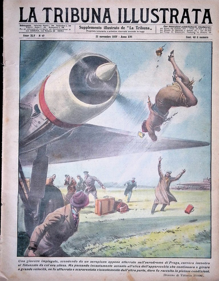 Una giovane impiegata, scendendo da un aeroplano appena atterrato nell'aerodromo di Praga, correva incontro al fidanzato da cui era attesa. Ma passando incautamente accanto all'elica dell'apparecchio che continuava a girare a grande velocità ne fu afferrata e scaravantata violentemente dall'altra parte, dove fu raccolta in pietose condizioni (disegno di Vittorio Pisani)