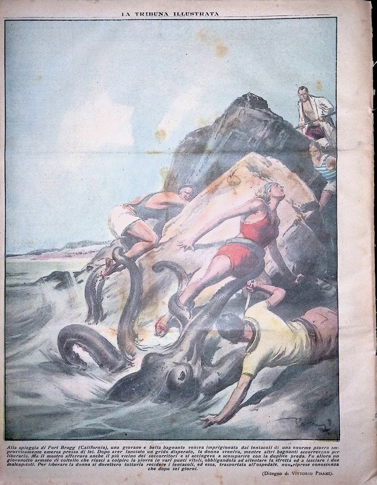 Alla spiaggia di Fort Bragg (California) una giovane e bella bagnante veniva imprigionata dai tentacoli di una enorme priovra improvvisamente emersa presso di lei. Dopo aver lanciato un grido disperato, la donna sveniva mentre altri bagnanti accorrevano per liberarla. Ma il mostro afferrava anche il più vicino dei soccorritori e si accingeva a scomparire con la duplice preda. Fu allora un giovanotto armato di coltello che riuscì a colpire la piovra in vari punti, obbligandola ad allentare la stretta ed a lasciare i due malcapitati. Per liberare la donna si dovettero tuttavia recidere i tentacoli, ed essa, trasportata all'ospedale non riprese conoscenza che dopo sei giorni (disegno di Vittorio Pisani)