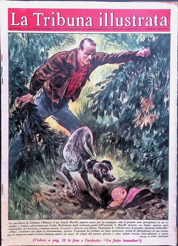Un cacciatore di Limbiate (Milano), il sig Angelo Marelli, appena uscito per la campagna vide il proprio cane precipitarsi in un cespuglio e raspare affannosamente l'erba. Richiamato dagli insistenti guaiti dell'animale, il Marelli accorse: un bimbo appena nato, semisepolto nel terriccio, respirava ancora. Lo prese e corse in una clinica. Nonostante le sollecite cure, il neonato, chiamato subito Marcellino, ventinove ore dopo il ritrovamento, spirava. L'autopsia ha rivelato un fatto mostruoso: prima di abbandonare la sua creatura, la snaturata madre l'aveva sbattuta contro un muro. Il cranio del povero piccino è stato infatti trovato letteralmente a pezzi.