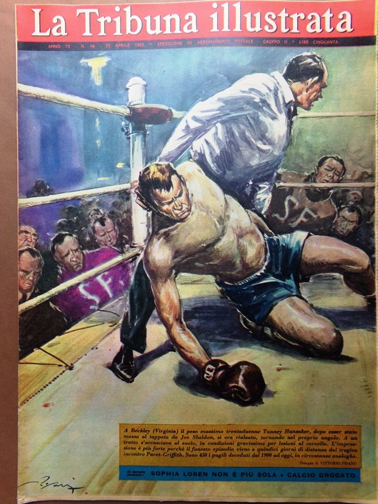 A Beckley (Virginia) il peso massimo Tunney Hunsaker, dopo essere stato messo al tappeto da Joe Sheldon si era rialzato, tornando nel proprio angolo. A un tratto s'accasciava al suolo, in condizioni gravissime, per lesioni al cervello. L'impressione è più forte perché il funesto episodio viene a 15 giorni di distanza dal tragico incontro Paret-Griffith (disegno di Vittorio Pisani)
