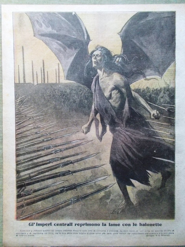 Sommosse e sedizioni ardono con sempre crescente intensità sulle terre di Germania e d'Austria. La fame bussa a ogni porta. Le Autorità cercano di scacciarla e di reprimerla col ferro, ma la voce della triste megera si eleva ancora più forte, come volesse far comprendere che ormai essa è la voce stessa di tutto un popolo (disegno di A. Minardi)