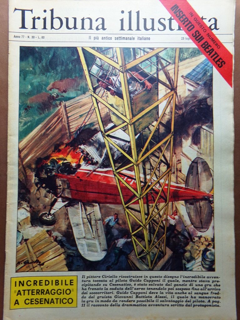 Il pittore Ciriello ricostruisce in questo disegno l'incredibile avventura toccata al pilota Guido Capponi il quale, mentre stava precipitando su Cesenatico, è stato salvato dal gancio di una gru che ha frenato la caduta dell'aereo tenendolo poi sospeso fino all'arrivo dei soccorritori grazie anche al sangue freddo del gruista Giovanni Battista Alessi (disegno di Ciriello)