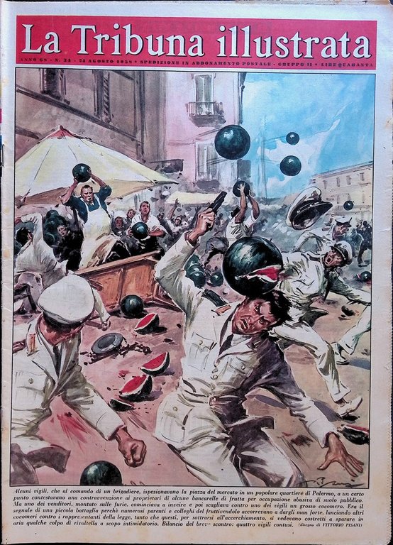 Alcuni vigili, che al comando di un brigadiere, ispezionavano la piazza del mercato in un popolare quartiere di Palermo, a un certo punto contestavano una contravvenzione ai proprietari di alcune bancarelle di frutta per occupazione abusiva di suolo pubblico. Ma uno dei venditori, montato sulle furie, cominciava a inveire e poi scagliava contro uno dei vigili un grosso cocomero. Era il segnale di una piccola battaglia perché numerosi parenti e colleghi del fruttivendolo accorrevano a dargli man forte, lanciando altri cocomeri contro i rappresentanti della legge, tanto che questi, per sottrarsi all'accerchiamento, si vedevano costretti a sparare in aria qualche colpo di rivoltella a scopo intimidatorio. Bilancio del breve scontro: quattro vigili contusi.