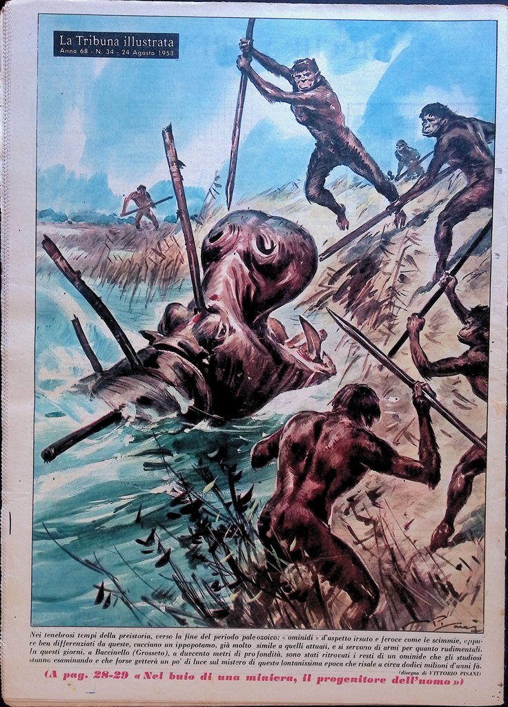 Nei tenebrosi tempi della preistoria, verso la fine del periodo paleozoico: « ominidi » d'aspetto irsuto e feroce come le scimmie, eppure ben differenziati da queste, cacciano un ippopotamo, già molto simile a quelli attuali, e si servono di armi per quanto rudimentali. In questi giorni, a Baccinello (Grosseto), a duecento metri di profondità, sono stati ritrovati i resti di un ominide che gli studiosi stanno esaminando e che forse getterà un po' di luce sul mistero di questa lontanissima epoca che risale a circa dodici milioni d'anni fa.