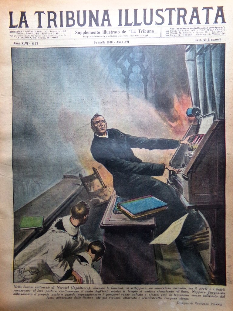 Nella famosa cattedrale di Norwich (Inghilterra), durante le funzioni, si sviluppava un minaccioso incendo, ma il prete e i fedeli rimanevano al loro posto e continuavano il canto degl'inni, mentre il tempio si andava riempiendo di fumo. Neppuer l'organista abbandonava il proprio posto e quando sopraggiunsero i pompieri venne salvato a stento: essi lo trovarono mezzo asfissiato dal fumo, minacciato dalle fiamme che già avevano attaccato e semidistrutto l'organo stesso (disegno di Vittorio Pisani)