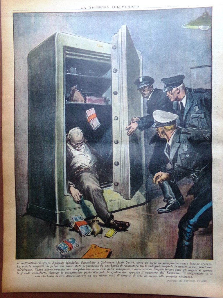 Il multimilionario greco Apostolo Kuskulas, domiciliato a Galveston (Stati Uniti), circa un mese fa scompariva senza lasciar traccia. La polizia sospettò da prima che fosse stato sequestrato da una banda di ricattatori, ma le indagini compiute in questo senso riuscirono infruttuose. Venne allora operata una perquisizione nella casa dello scomparso e dopo averne frugato invano tutti gli angoli si aperse la grande cassaforte. Appena la pesantissima porta d'acciaio fu spalancata, apparve il cadavere del Kuskulas: il disgraziato vi si era rinchiuso dentro distrattamente ed era morto, così, di fame e di sete in mezzo alla propria ricchezza (disegno di Vittorio Pisani)