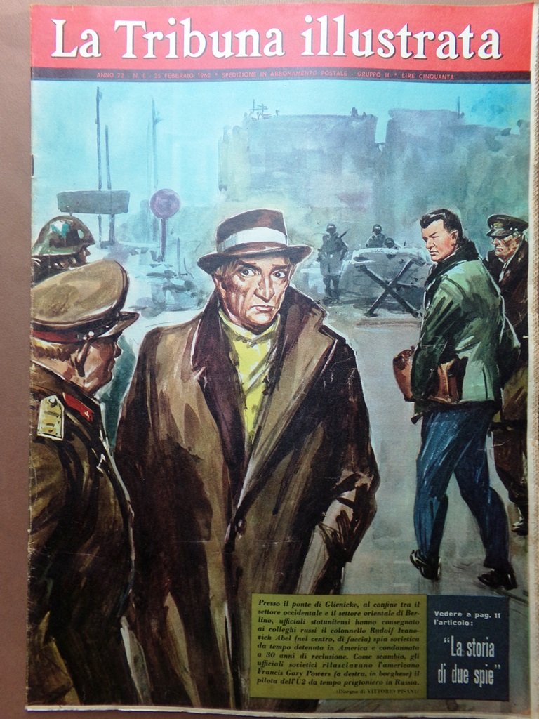 Presso il ponte di Glienicke, al confine tra il settore occidentale e il settore orientale di Berlino, ufficiali statunitensi hanno consegnato ai colleghi russi il colonnello Rudolf Ivanovich Abel, spia sovietica da tempo detenuta in America e condannata a 30 anni di reclusione. Come scambio gli ufficiali sovietici rilasceranno l'americano Francis Gary Powers il pilota dell'U2 da tempo prigioniero in Russia (disegno di Vittorio Pisani)