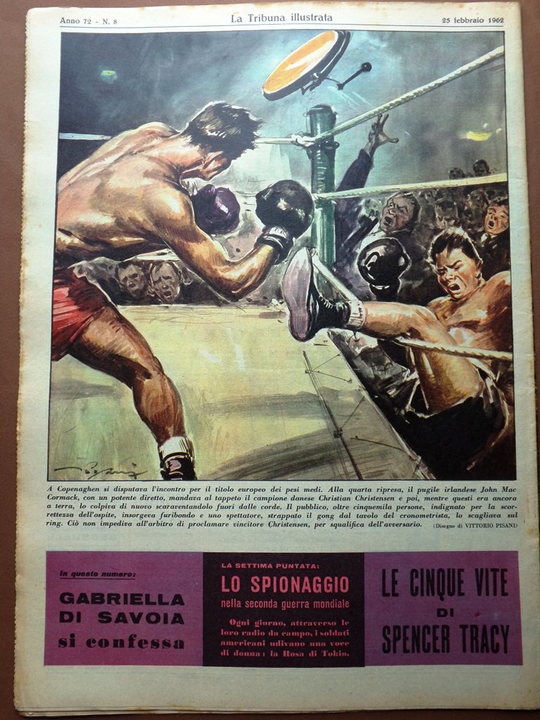A Copenaghen si disputava l'incontro per il titolo europeo dei mesi medi. Alla quarta ripresa il pugile irlandese John Mac Cormack con un potente diretto, mandava al tappeto il campione danese Christian Christensen e poi, mentre questi era ancora a terra, lo colpiva di nuovo scaraventandolo fuori dalle corde (disegno di Vittorio Pisani)