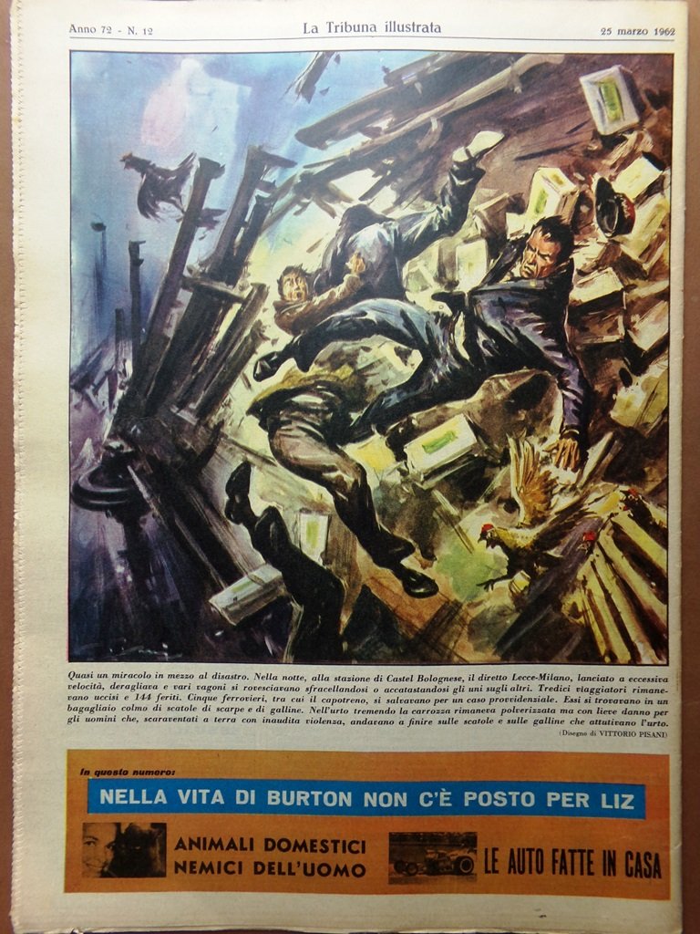 Quasi un miracolo in mezzo al disastro. Nella notte, alla stazione di Castel Bolognese, il diretto Lecce-Milano, lanciato a eccessiva velocità, deragliava e vari vagoni si rovesciavano sfracellandosi o accatastandosi gli uni sugli altri. Tredici viaggiatori rimanevano uccisi e 144 feriti. Cinque ferrovieri, tra cui il capotreno, si salvavano per miracolo (disegno di Vittorio Pisani)