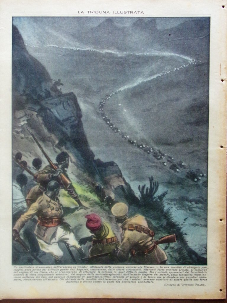 Un particolare drammatico dell'avanzata su Gondar della colonna autocarrata Starace. In un passaggio obbligato assistevano dalle alture circostanti rilevanti forze nemiche armate che volevano attaccare la colonna. I soldati spaventati dal numero di circa cinquecento autocarri, dalle armi, dal fragore dei motori rinunziarono all'attacco, ritenendo la colonna una forza diabolica o divina (disegno di Vittorio Pisani)