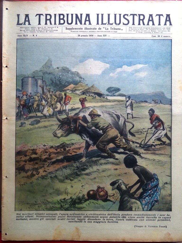 Nei territori etiopici occupati, l'opera ordinatrice e civilizzatrice dell'Italia produce immediatamente i suoi benefici effetti. Numerosissimi pozzi forniscono abbondante acqua potabile raccolta in capaci serbatoi mentre gli speciali aratri dissodano la terra finora coltivata con mezzi primitivi (disegno di Vittorio Pisani)