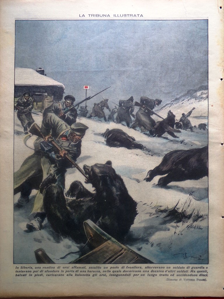 In Siberia, una ventina di orsi affamati, assalito un posto di frontiera atterravano un soldato di guardia e tentavano di sfondare la porta di una baracca dove dormivano una dozzina d'altri soldati. Ma questi, balzati in piedi, caricavano alla baionetta gli orsi inseguendoli per un lungo tratto e uccidendone dieci (disegno di Vittorio Pisani)