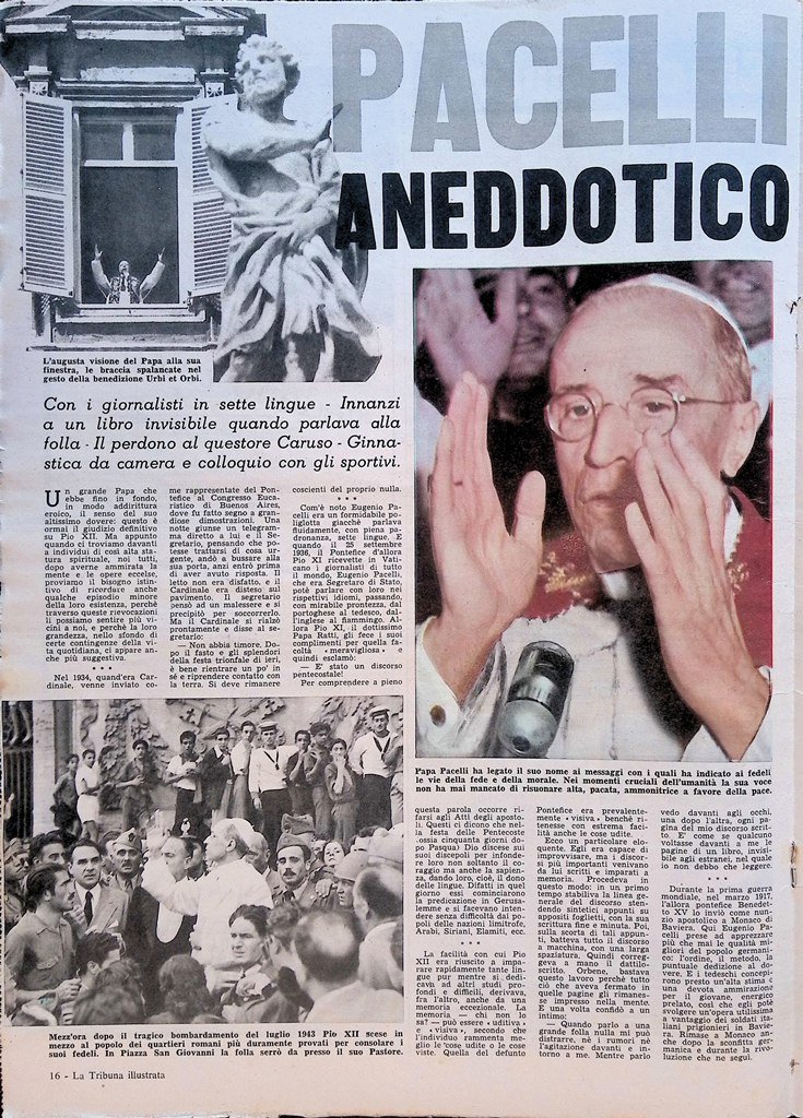 A Roma, nella basilica di San Pietro: per due giorni e mezzo un devoto, interminabile corteo di fedeli e anche di gente d'altre religioni viva testimonianza d'universale cordoglio, è sfilato per rendere il supremo omaggio alla salma di Pio XII, prima che fosse inumata nelle Grotte Vaticane, dove riposarono a lungo i resti mortali di Pio X.