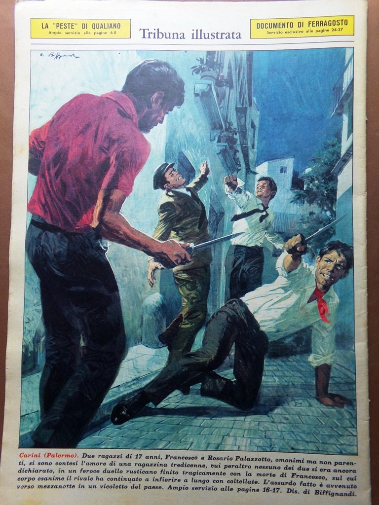 Carini (Palermo): due ragazzi di 17 anni, Francesco e Rosario Palazzotto, omonimi ma non parenti, si sono contesi l'amore di una ragazzina tredicenne, cui peraltro nessuno dei due si era ancora dichiarato, in un feroce duello rusticano finito tragicamente con la morte di Francesco sul cui corpo esanime il rivale ha continuato a infierire a lungo con coltellate (disegno di Biffignandi)
