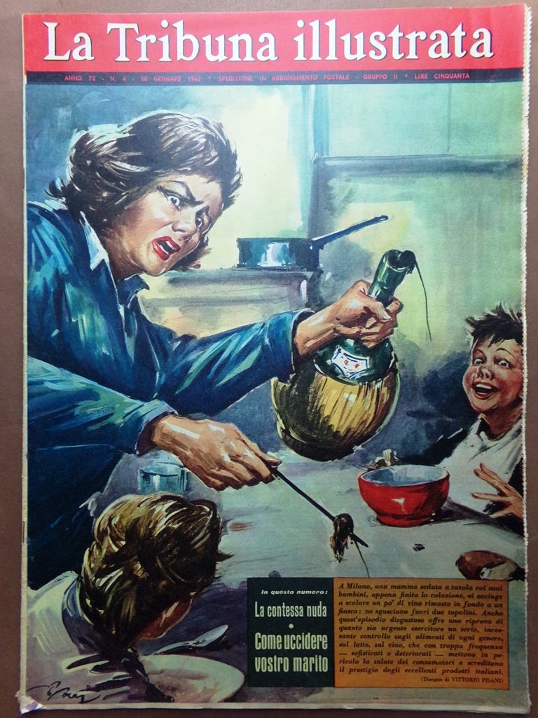 A Milano, una mamma seduta a tavola coi suoi bambini, appena finita la colazione, si accinge a scolare un po' di vino rimasto in fondo a un fiasco: ne sgusciano fuori due topolini. Anche questo episodio disgustoso offre una riprova di quanto sia urgente esercitare un serio, incessante controllo sugli alimenti di ogni genere (disegno di Vittorio Pisani)