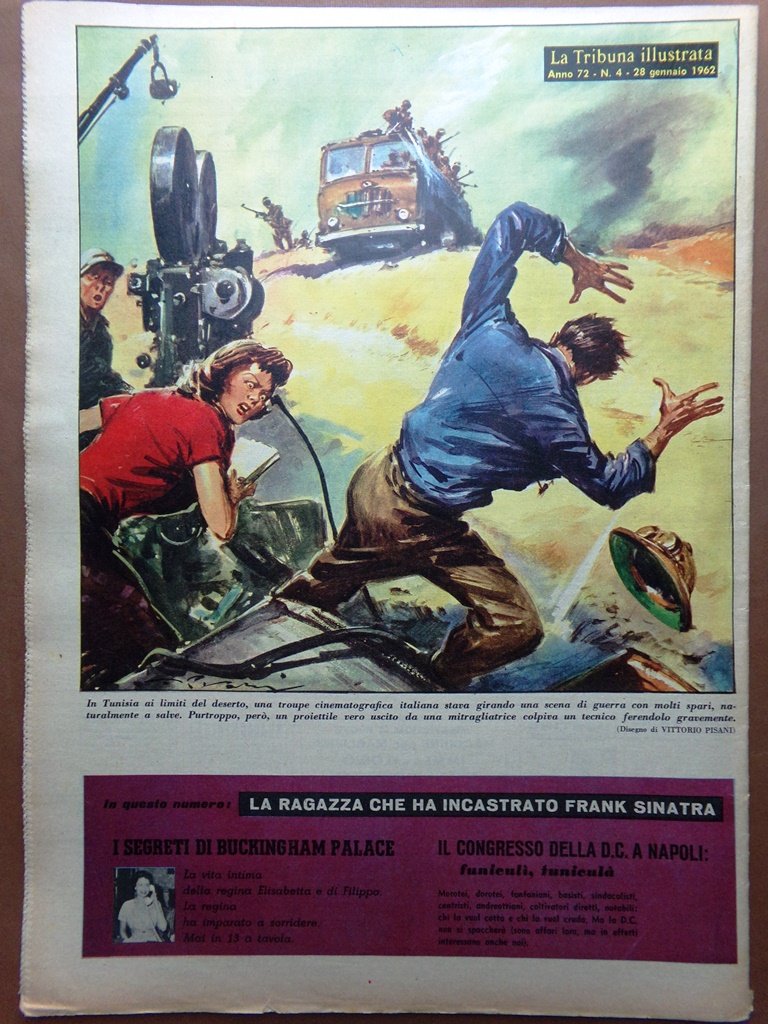 In Tunisia ai limiti del deserto, una troupe cinematografica italiana stava girando una scena di guerra con molti spari, naturalmente a salve. Purtroppo, però, un proiettile vero uscito da una mitragliatrice colpiva un tecnico ferendolo gravemente (disegno di Vittorio Pisani)