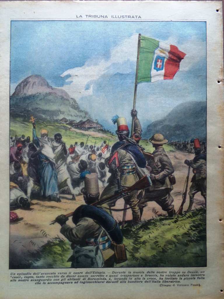 Durante la marcia delle nostre truppe su Dessiè, un "cascì" copto, tanto vecchio da dover essere sorretto ha voluto andare incontro alle nostre avanguardie con gli abitanti di Borumieda e, levando in alto la croce, ha invitato la piccola folla ad inginocchiarsi davanti la bandiera dell'Italia liberatrice (disegno di Vittorio Pisani)