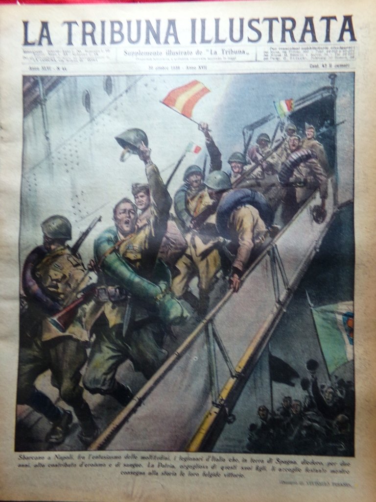 Sbarcano a Napoli, fra l'entusiasmo delle moltitudini, i legionari d'Italia che, in terra di Spagna, diedero, per due anni, alto contributo d'eroismo e di sangue. La Patria, orgogliosa di questi suoi figli, li accoglie festante, mentre consegna alla storia le loro fulgide vittorie (disegno di Vittorio Pisani)