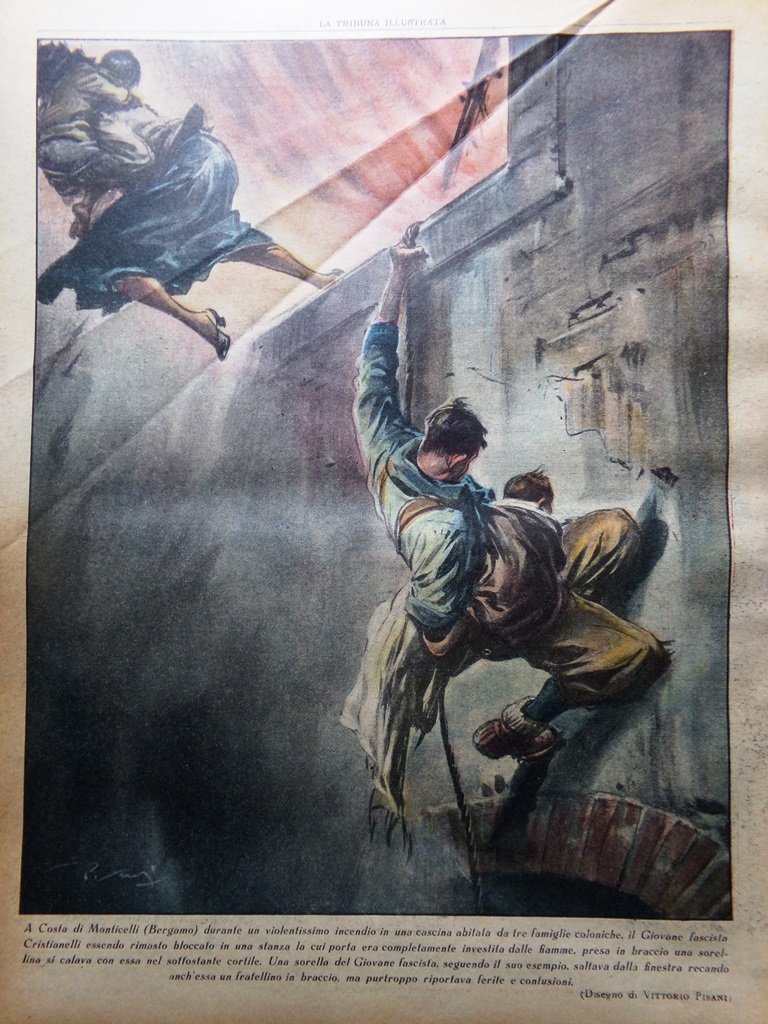 A Costa di Monticelli (Bergamo), durante un violentissimo incendio in una cascina abitata da tre famiglie coloniche, il Giovane fascista Cristianelli essendo rimasto bloccato in una stanza la cui porta era completamente investita dalle fiamme, presa in braccio una sorellina si calava con essa nel sottostante cortile. Una sorella del Giovane fascista, seguendo il suo esempio, saltava dalla finestra recando anch'essa un fratellino in braccio ma purtroppo riportava ferite e contusioni (disegno di Vittorio Pisani)