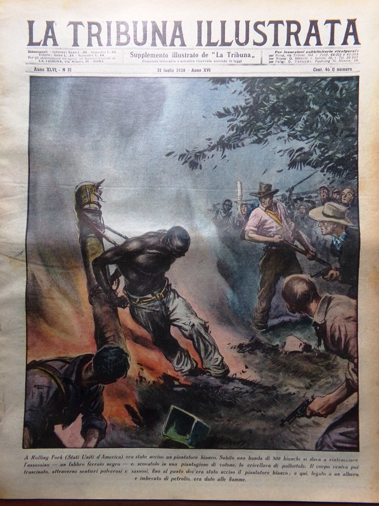 A Rolling Fork (Stati Uniti d'America) era stato ucciso un piantatore bianco. Subito una banda di 300 bianchi si dava a rintracciare l'assassino, un fabbro ferraio nero, e scovatolo in una piantagione di cotone, lo crivellava di pallottole. Il corpo veniva poi trascinato, attraverso sentieri polverosi e sassosi, fino al punto dov'era stato ucciso il piantatore bianco; e qui, legato a un albero e imbevuto di petrolio era dato alle fiamme (disegno di Vittorio Pisani)