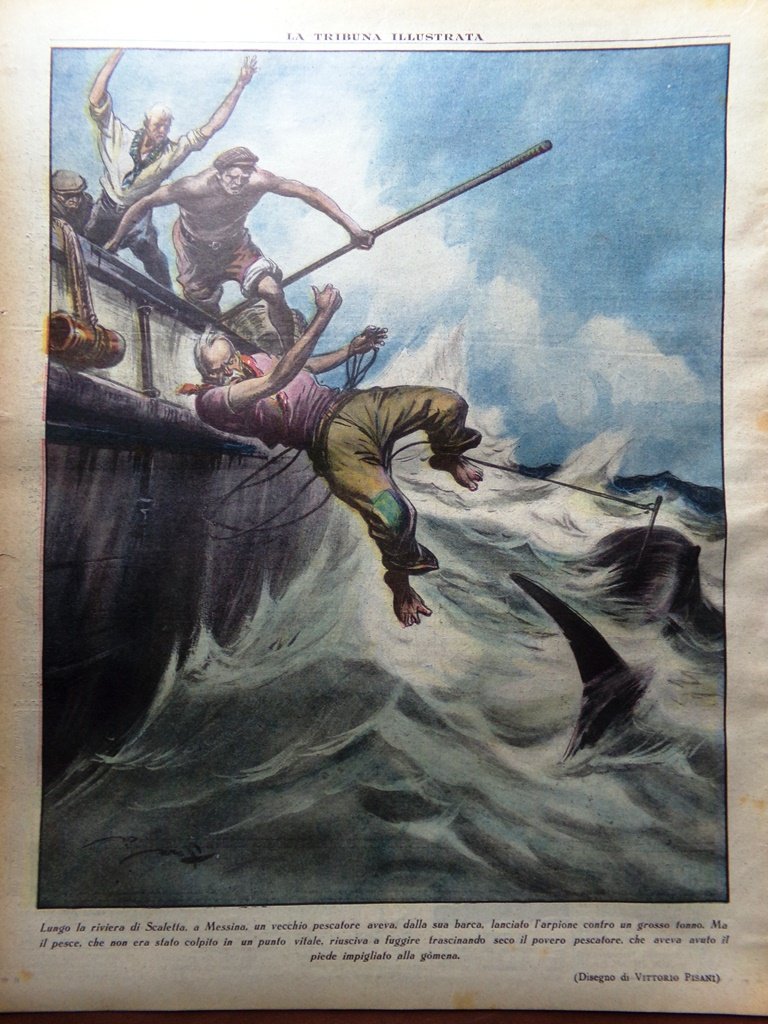 Lungo la riviera di Scaletta, a Messina, un vecchio pescatore aveva, dalla sua barca, lanciato l'arpione contro un grosso tonno. Ma il pesce, che non era stato colpito in un punto vitale, riusciva a fuggire trascinando seco il povero pescatore, che aveve avuto il piede impigliato alla gòmena (disegno di Vittorio Pisani)