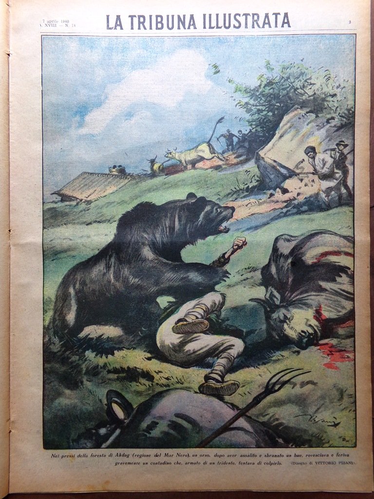Nei pressi della foresta di Akdag (Mar Nero) un orso, dopo aver assalito e sbranato un bue, rovesciava e feriva gravemente un contadino che tentava di colpirlo (disegno di Vittorio Pisani)