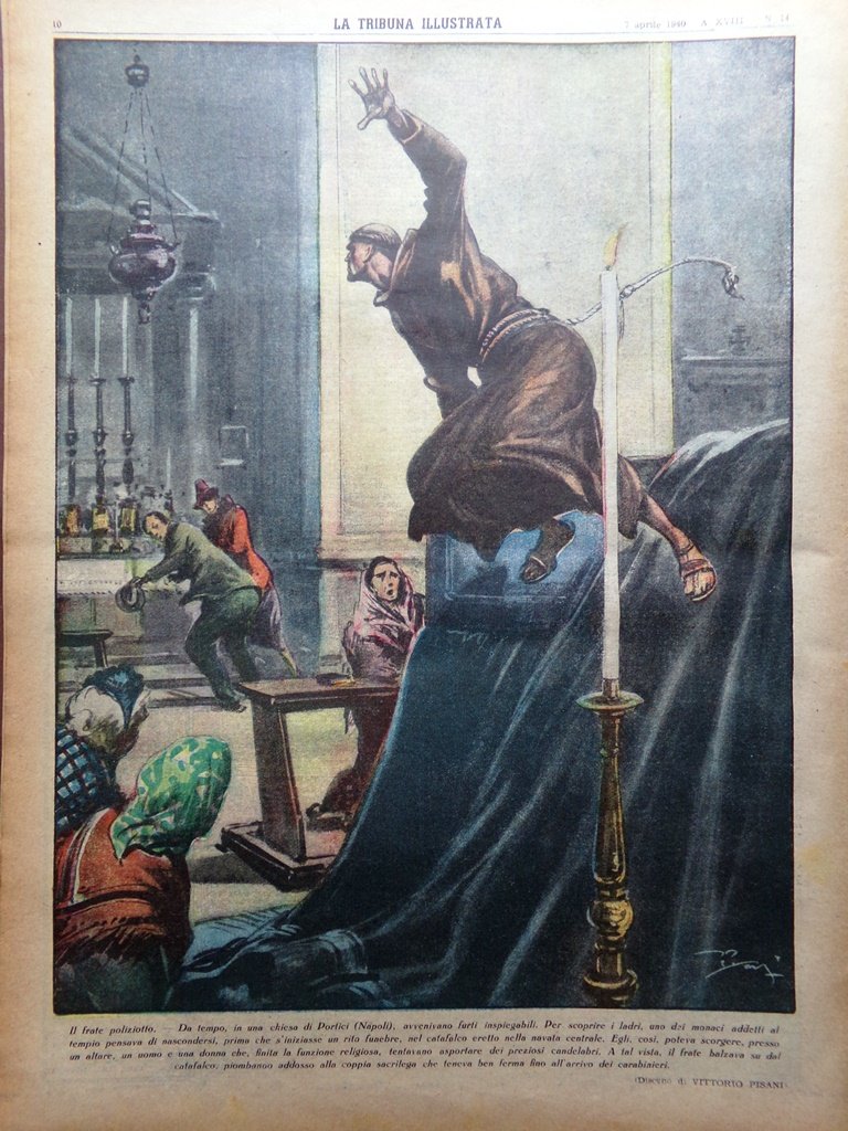Da tempo in una chiesa di Portici (Napoli) avvenivano furti inspiegabili. Per scoprire i ladri, uno dei monaci addetti al tempio si nascose e riuscì a beccare i ladri (disegno di Vittorio Pisani)