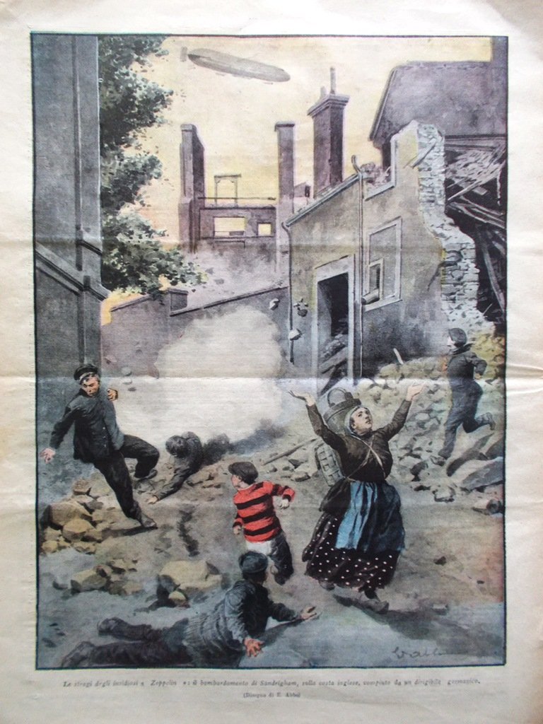 La strage degli insidiosi "Zeppelin": il bombardamento di Sandrigham, sulla costa inglese, compiuto da un dirigibile germanico (disegno di E. Abbo)