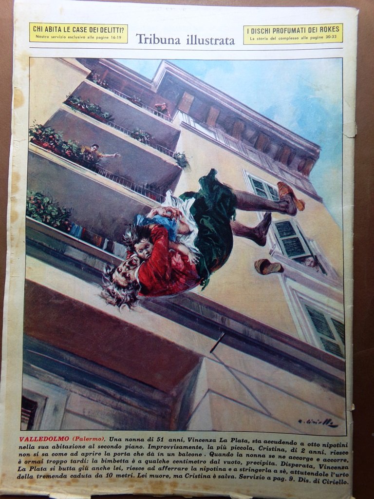 Valledolmo (Palermo): una nonna di 51 anni, Vincenza La Plata, sta accudendo a otto nipotini nella sua abitazione al secondo piano. Improvvisamente la più piccola, Cristina di 2 anni, riesce ad aprire la porta che da in un balcone. Quando la nonna se ne accorge e accorre è ormai troppo tardi: la bimbetta è a qualche centimetro dal vuolo, precipita. Disperata, Vincenza La Plata si butta giù anche lei, riesce ad afferrare la nipotina e a stringerla a s+, attutendole l'urto dalla tremanda caduta di 10 metri. Lei muore, ma Cristina è salva (disegno di Ciriello)