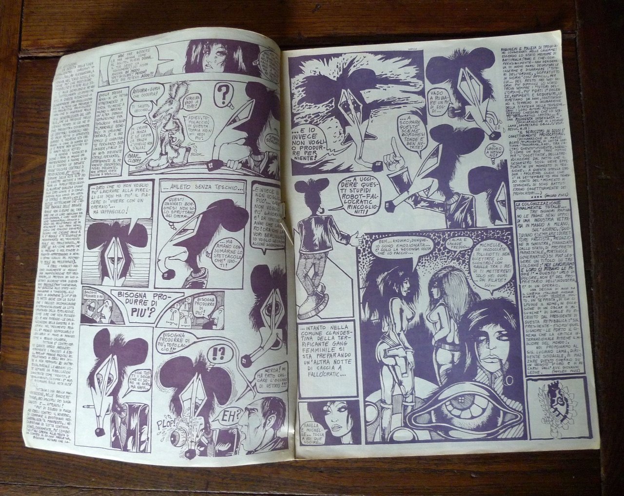 PUZZ n.13 aprile-maggio-giugno 1974TOPOLACCIO E LA TERRIFICANTE GANG FEMMINILECONTRO FALLO'CRATICTrimestrale.Coordinatore: Maximilian Capa.Edizioni Puzz, Milano 1974,brossura, rilegatura con punto metallico,30,5x22 cm., pp.20,illustrazioni e fumetti in bianco e nero,peso: g.300cod.100115CONDIZIONI DELL'ALBO: buone,i punti metallici sono ossidati,strappetto in prossimità di un punto metallico,pieghette agli angoli