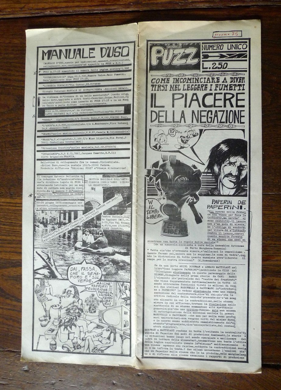 PUZZ NUMERO UNICO gennaio 1975.COME INCOMINCIARE A DIVERTIRSI NELLEGGERE I FUMETTI.IL PIACERE DELLA NEGAZIONE.Responsabile Redazione: Maximilian Capa.Direttore responsabile: Antonio Bellavita.Vicedirettore: Emilio VesceEdizioni Puzz, Milano 1975,brossura, rilegatura con punto metallico,33x11,5 cm. (oblungo), pp.20,illustrazioni e fumetti in bianco e nero,peso: g.300cod.100119CONDIZIONI DELL'ALBO: discrete,data a penna rossa al frontespizio,sottolineature e segni a penna rossa e nera,pieghe,pagine leggermente ingiallite