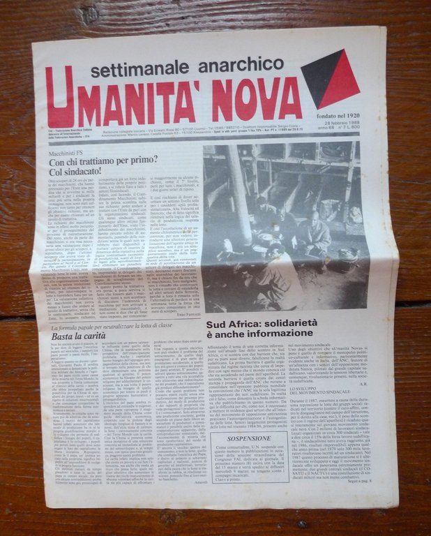 UMANITÀ NOVA Anno 68 n.7 28 febbraio 1988Settimanale anarchico.Direttore responsabile: Sergio Costa.40x30 cm., pp.8,illustrazioni in bianco e nero,peso: g.300cod.100101CONDIZIONI DEL PERIODICO: buone,piega centrale,pagine leggermente ingiallite,fioriture